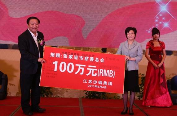 2003年“非典”期間,向淮安市政府捐贈10萬元。向淮安市慈善基金會捐款35萬元用于慈善事業(yè)。向淮安市慈善總會捐款100萬元,用于關(guān)愛困難職工和外來務(wù)工人員。2010年,沙鋼集團(tuán)安陽永興公司向河南省安陽縣水治鎮(zhèn)區(qū)殘疾人捐款6萬元。