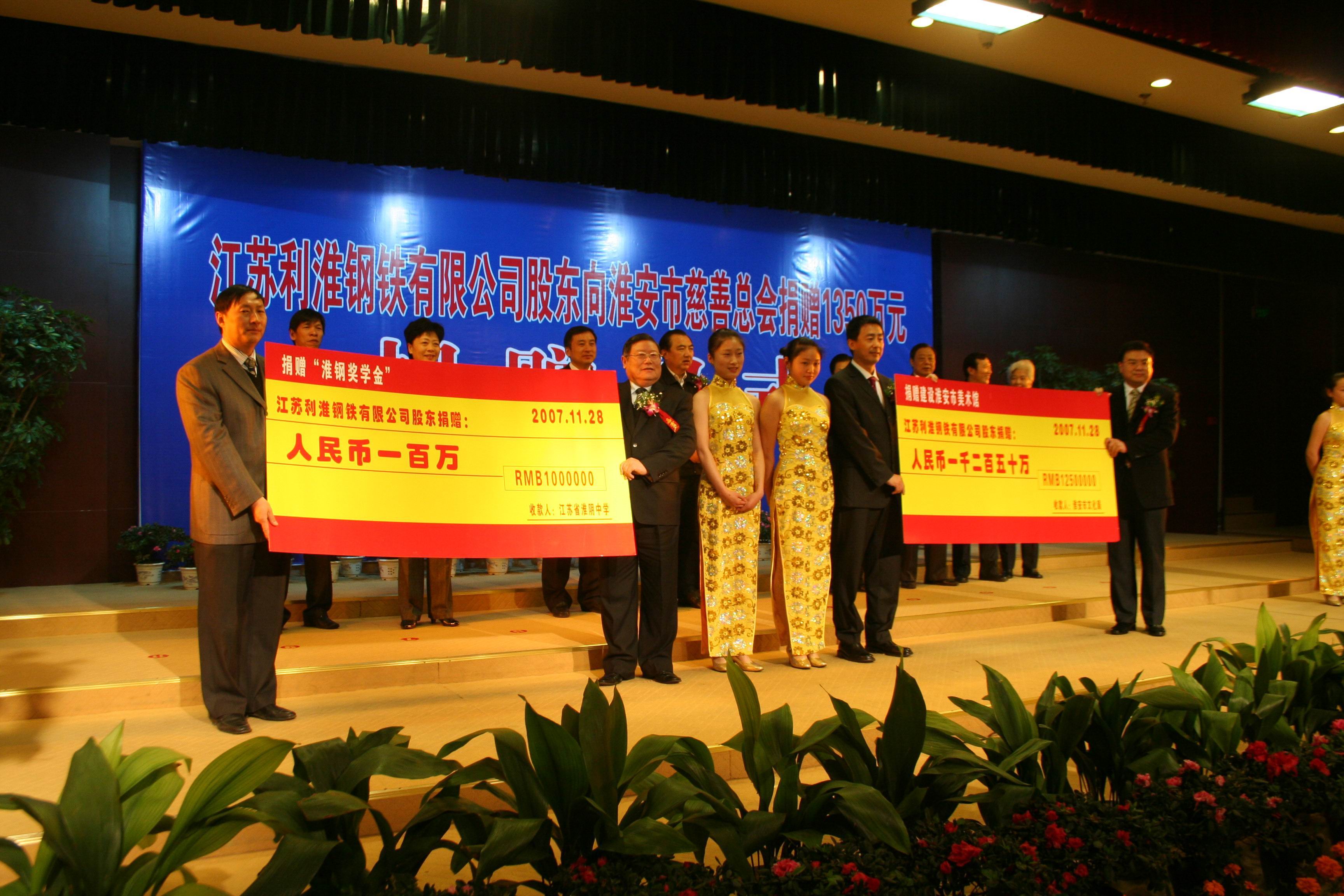 2002年,沙鋼淮鋼特鋼公司在淮陰區(qū)五里小學(xué)成立“淮鋼春蕾班”,每年資助1.5萬元;2007年向淮安市慈善總會捐贈1350萬元,其中1250萬元由市慈善總會定向捐贈淮安市利淮“美術(shù)館”,另100萬元贈給江蘇省淮陰中學(xué)作為“淮鋼獎學(xué)金”;向淮安團(tuán)市委希望辦捐款以及向淮安盱眙穆店 鄉(xiāng)中心小學(xué)捐贈“愛心禮盒”等捐款累計112萬元。